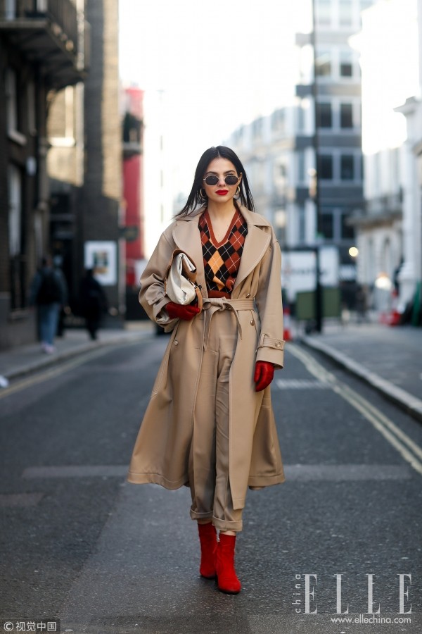 卡其色的包容性非常好,内搭砖红色菱格纹毛衣酷味十足。