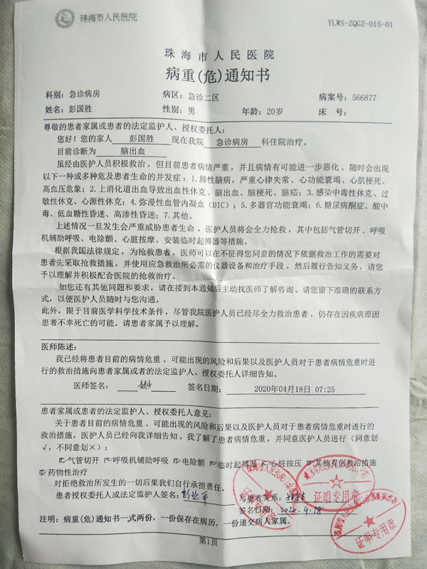 2020年4月17日晚21时开始,我儿子彭某胜出现高烧,意识有点模糊,说话乱语,后送往广东省人民医院珠海市金湾中心医院,于4月18日凌晨初步检查诊断为:脑出血脑动脉瘤。当日早上转入广东省珠海市人民医院,确证结果与广东省人民医院珠海市金湾中心医院一致。