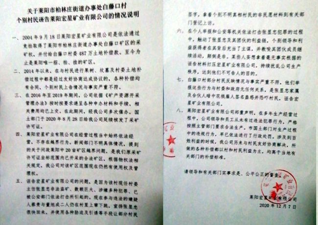 莱阳宏星矿业的一名员工发来了一份《关于莱阳市柏林庄街道办事处白藤村个别村民诬告莱阳宏星矿业有限公司的情况说明》,称2004年公司是依法通过竞拍取得涉事矿区的采矿权,是至今为止莱阳唯一招、拍、挂的矿区。支付给村委487万元土地补偿款,在与村民进行果树、坟墓及村委补偿过程中经过友好协商达成协议,个别村民上告情况与事实严重不符。
