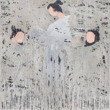 从东方美学平面化的点线面逸性游走的方式,到几何性状或近于混沌的冷灰、暖色、黑、褐中性色块的相互融合、碰撞、渗透,形成厚厚、微妙的色层。矿物颜色多层的叠加之下颗粒的质感反射出历经沧桑岁月洗礼的厚重、坚实、浑然若远古的回响附着于画布。相互对比交互形成的关系、情绪。在《和平》、《七子》等等作品形成历史与当下的对话关系,展开东西对话,过去与现代的对话,色彩稳重、内敛、含蓄的灰重底色托起祥和的图像,或具象或抽象的人物符号影影绰绰,《和平》中间似乎流淌的是泪水、鲜血,抑或是希望之泉的象征,被由内而外的光线投射出来,获得超越历史、地域、民族的崇高与精神本质的追求。