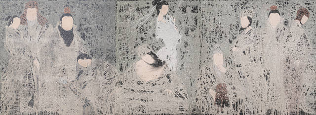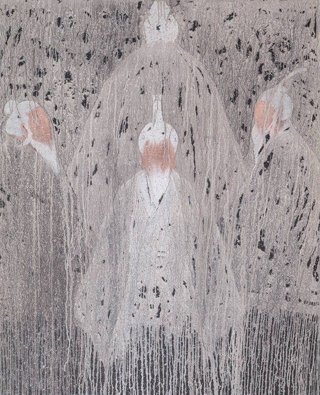 中国古代壁画艺术与当代艺术创作之间既有历史的直接传承,又有时代的重新创造,壁画中业已凄婉的容貌和残缺漫漶的历史信息,为袁小楼的创作注入了无限的艺术灵感,使其觉悟到抽象语言与材料融合重新建构视觉文化的契机。扎实地写实功底和造型能力是袁小楼早期在业界展露头角的风格,然而这既是能力也是束缚。每个艺术家创作风格的转变,都必然历经痛苦的蜕变。对媒介材料的实验,打开了袁小楼表现世界新的窗口。粗粝的材质,自由流淌的色层痕迹,在控制与失控中,形成偶然与必然的融合,这既是中国传统艺术精神在“似与不似”间追求真谛的旨趣,亦是袁小楼走入人生阶段明晰自我的过程。无论画面中描绘的是佛教造像亦或现代人物,从根本上讲,任何对传统符号的重构,都是对其魂魄的召唤与体味。其创作趋向均是激活传统符号记忆之上所建立的新文化意识,即一种传统资源的转型式再生。