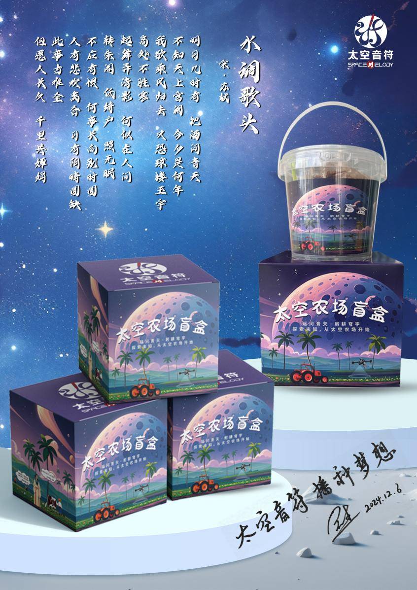 太空农场盲盒以“传统农耕—现代农科—太空农业”为主线,融合原国家首批航天员兼航天员教练吴杰题写的“太空音符,播种梦想”、苏轼《水调歌头》“明月几时有,把酒问青天”的意境及星轨纹样,展现传统文化与航天科技的深度交融。设计团队通过‘天-地-人’和谐共生的东方美学,诠释了太空育种与农耕文明跨越时空的对话,将古典诗词对苍穹的哲思与当代航天探索的壮举诗意联结,同时将《水调歌头》全文一同搭载,凸显中华文明一脉相承的求索精神。
