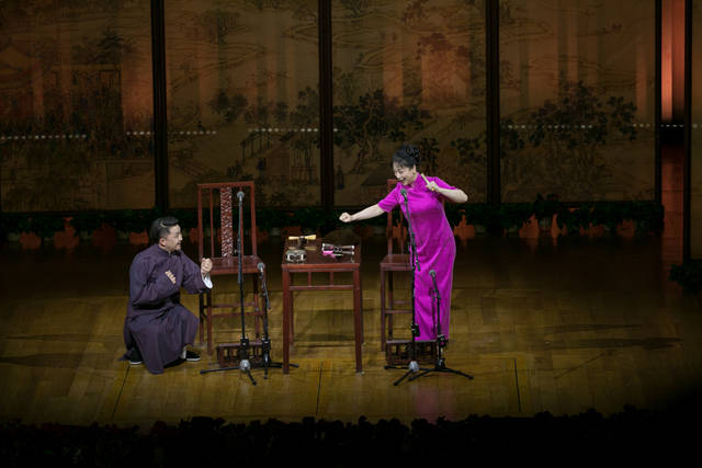“此次我们来国家大剧院演出的《北洋春》《雪庐夜宴》《花落谁家》《雨夜婚变》这4个章回,是在边演边改的过程中推出的最新版本,其中《北洋春》一回首次由我的学生、苏州市评弹团青年演员陆佳麒、谢岚演出,这也是一个传承的过程。有青年演员的加入,我们才更有信心。不仅如此,我们也要培养青年观众,让他们慢慢喜欢上苏州评弹,一定要‘双向奔赴’。这些年,我们一直在努力开展这方面的培养工作,我觉得这是一件非常重要的事情。同时,衷心感谢我的合作伙伴高博文、施斌和吴伟东,正因他们这几位当今评弹界中坚力量的倾情投入,《娜事Xin说》才能够最终顺利地、高质量地呈现于舞台。”盛小云表示,“2023年我们曾在北京长安大剧院演出过,刚才好多观众说你们又改了,是的,我们是‘一边拆洗一遍新’,这也是包括苏州评弹在内的曲艺艺术的独特魅力。苏州评弹的说、学、弹、唱、演各方面都在与时俱进、不断创新,如果不创新就会被淘汰。比如演出中,我们吸收很多影视剧的表现手法,何丽娜照镜子,她看着镜子里的人,其实是在跟自己的内心对话,这就是一处创新,传统的苏州评弹没有过这种表演形式。”