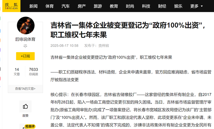 吉林省一集体企业被变更登记为“政府100%出资”,职工维权七年未果